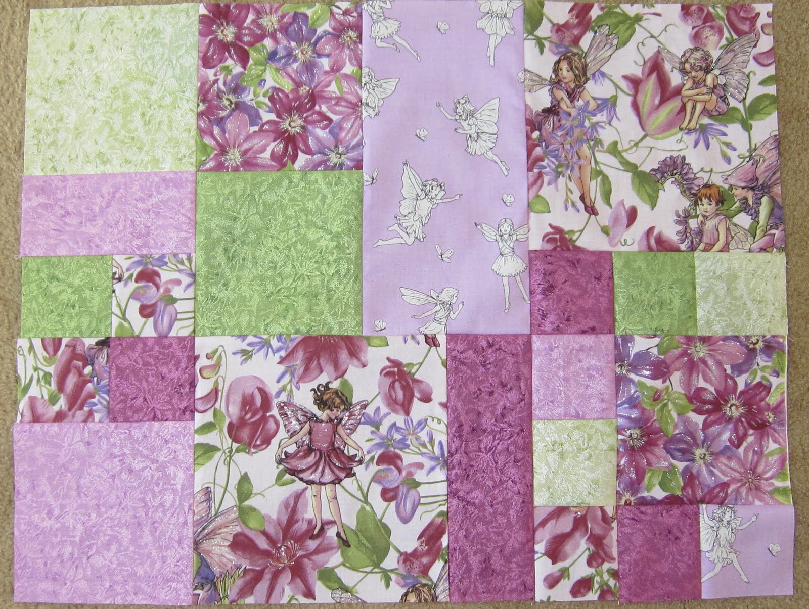 I had this design concept when I ordered the fabric but wasn't really sure how much yardage to buy so of course I played it safe and ordered too much. But that's OK since it is all beautiful and I will have a fabulous stash for future projects. When I ordered this lot I didn't realize that the Large Fairy print was as big a print as it is. I had thought to use it as the central border but when I saw it in person I preferred the flower print. I only ordered a 1/2 yard of the flower print which wasn't quite enough, so I added the rectangles in the border using the Large Fairy fabric. I improvised. I heard an artist say lately, sorry can't remember the source, but they said if he knows ahead of time how the project will be exactly then it isn't worth creating. I agree. There has to be room for the creative process, something unexpected to emerge in the process of making something.